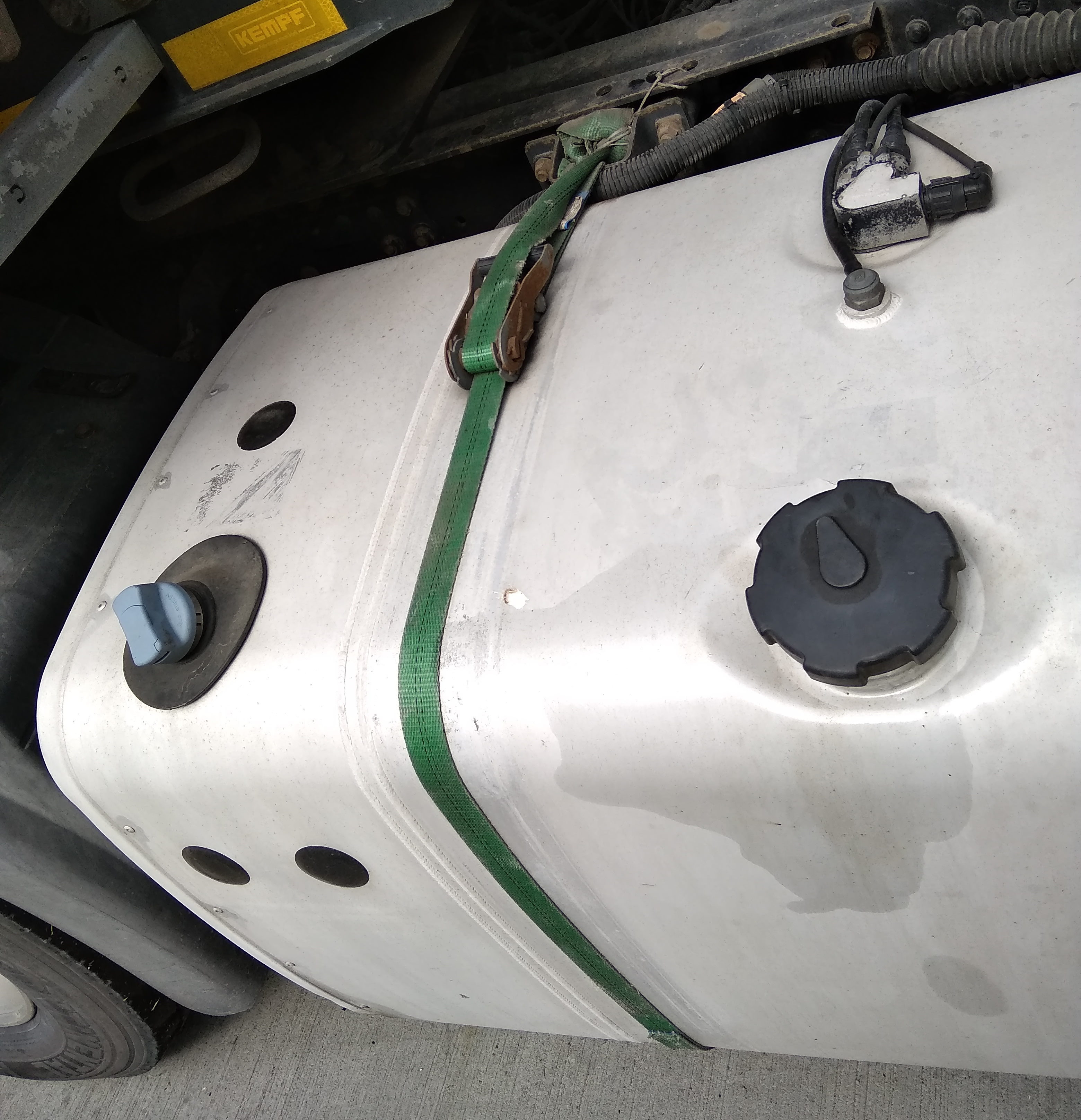 Kontrola stanu technicznego ciągnika siodłowego wykazała, że jedno z mocowań zbiornika paliwa zostało zastąpione, niepewnie zamocowanym, pasem transportowym. Dodatkowo